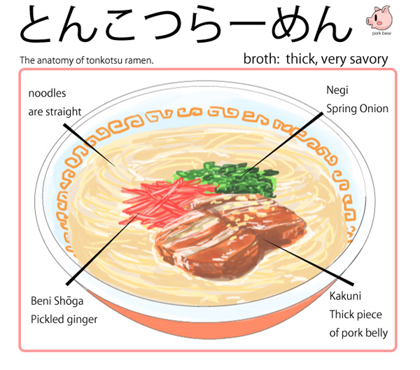 Tonkotsu ramen is made from pork bone. It is usually the thickest, most flavorful broth of the four.