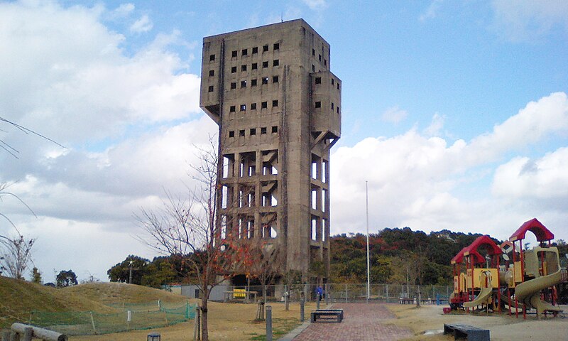 History: Here are the remains of a pre-war air shaft for mines. There are not many of these kind of shafts left standing anymore. Its distinct shape has inspired people to make paper-cut out models of it. The area surrounding it has now become a park and in 2009 this building was recognized as an important cultural property and is now protected.